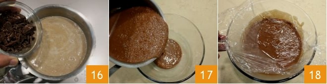 Immédiatement après, ajoutez également le chocolat haché précédemment 16 et faites-le fondre complètement en mélangeant. Versez le mélange obtenu dans un bol 17 et couvrez de film plastique au contact 18. Laissez refroidir à température ambiante pendant au moins 30 minutes, puis une heure au réfrigérateur.