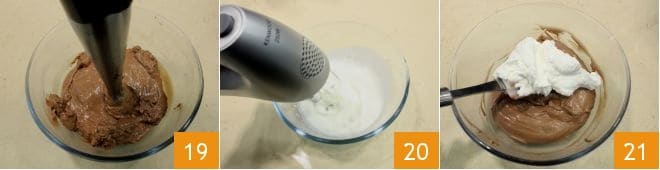 Après le temps nécessaire, reprenez la crème de noisettes et avec un mixeur plongeant, montez-la pour lisser le mélange 19; montez la crème fraîche dans un bol avec des fouets bien froids 20, puis incorporez-la à la crème de noisettes en mélangeant avec une spatule souple de haut en bas pour ne pas la démonter 21: votre garniture est prête.