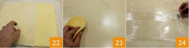 Lorsque le biscuit est froid, retirez le torchon et la couche de papier cuisson 22, puis passez un chiffon humide sur le plan de travail 23, puis étalez deux feuilles de film plastique légèrement plus longues de 5-6 cm par rapport aux dimensions du biscuit légèrement superposées 24