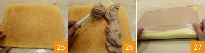 retournez le biscuit sur le film plastique et retirez également l'autre feuille de papier cuisson : la partie sombre du biscuit doit être tournée vers le haut 25; garnissez le biscuit avec une couche de crème de noisettes de 1 cm d'épaisseur, en laissant environ 1 cm du bord 26. Une fois terminé, roulez le biscuit en vous aidant du film plastique, en commençant du côté le plus long devant vous 27. Au fur et à mesure que vous roulez, n'oubliez pas d'enlever le film plastique en excès sur les bords.