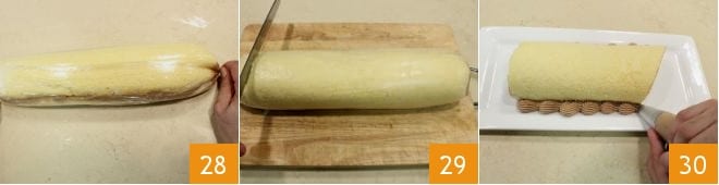 Une fois roulé, froncez le film plastique en excès sur les bords 28 et en tenant fermement les extrémités, tirez avec les mains vers l'extérieur et simultanément éloignez de vous le roulé en le faisant « marcher » sur le plan de travail, afin de le serrer comme un bonbon. En cas de bulles, percez le film plastique avec un couteau 29 : placez au réfrigérateur pour raffermir pendant au moins 40 minutes. Une fois refroidi, coupez les deux extrémités avec un couteau à lame lisse et placez le roulé sur un plat de service. Puis versez dans une poche à douille la crème de noisettes restante et décorez le roulé autour des côtés les plus longs avec des touffes 30