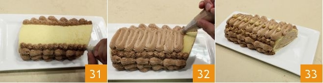 puis sur les côtés et enfin avec d'autres décorations de crème sur le dessus (31-32); votre roulé à la crème de noisettes est prêt à être dégusté 33 ! Vous pouvez le décorer à votre goût avec des noisettes entières ou concassées ou avec des pépites de chocolat !