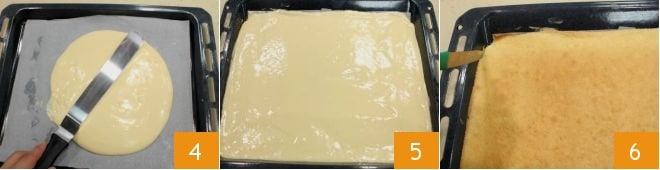 Prenez une plaque de cuisson 30x40, beurrez-la et chemisez-la de papier cuisson et étalez soigneusement la pâte avec une spatule 4 : vous devez obtenir une couche de 7 mm d'épaisseur 5. Cuire au four statique préchauffé à 220° pendant 8-9 minutes (si four ventilé à 200° pendant 4-5 minutes). Une fois cuit, retirez-le et, avec un petit couteau, détachez délicatement les bords qui ont collé au plat 6;