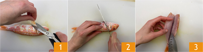 Pour préparer les rougets frits avec sauce aigre-douce, commencez par nettoyer les rougets : enlevez les écailles et coupez les nageoires 1, puis retirez la tête 2 et prélevez les filets en passant délicatement la lame d'un couteau le long de l'arête 3.