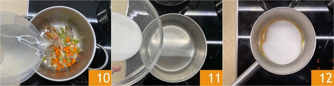 Versez de l'eau froide jusqu'à couvrir les arêtes et les légumes 10, puis laissez frémir pendant 30 minutes. À la fin, filtrez le liquide obtenu pour obtenir le fumet et réservez-le. Une fois le fumet prêt, occupez-vous de la sauce : versez le sucre dans une casserole 11 et faites-le fondre doucement 12 jusqu'à obtenir un caramel blond.