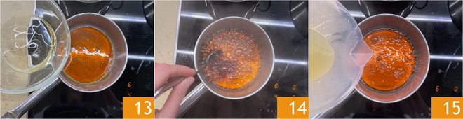 À ce stade, ajoutez le vinaigre avec précaution 13 et laissez réduire pendant environ 7 minutes 14, puis incorporez 300 g de fumet de rouget filtré 15.