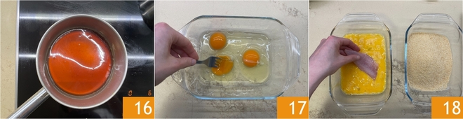 Poursuivez la cuisson encore 2 minutes, jusqu'à obtenir une sauce légèrement épaisse 16. Passez ensuite à la préparation des filets : battez les œufs dans un plat 17 et versez la chapelure dans un autre. Trempez d'abord les filets de rouget dans les œufs battus 18.