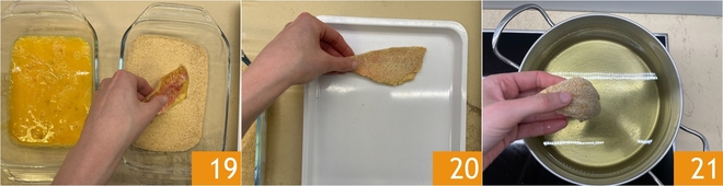 Puis passez-les dans la chapelure 19, en faisant bien adhérer la panure sur toute la surface, et disposez-les au fur et à mesure sur un plat 20. Vous êtes prêt à frire : chauffez l'huile d'arachide à 170° et plongez quelques filets à la fois 21 afin de ne pas faire baisser la température de l'huile.