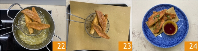 Faites frire les rougets pendant 2-3 minutes, jusqu'à ce qu'ils soient dorés et croustillants, puis égouttez 22 et transférez sur du papier absorbant 23. Disposez les filets de rouget frits sur le plat de service, garnissez de basilic et de persil haché et terminez avec la sauce aigre-douce servie à part 24.