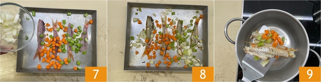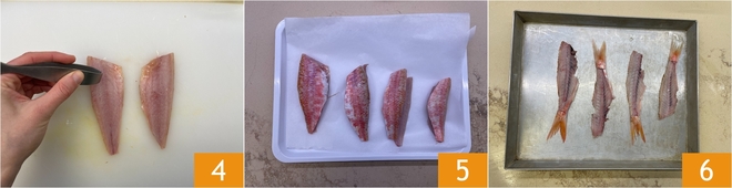 Mettez de côté les arêtes et parez les filets en éliminant les éventuelles arêtes résiduelles 4, puis tamponnez-les avec du papier absorbant pour bien les sécher et déposez-les sur un plat au réfrigérateur 5. Disposez les arêtes dans un plat allant au four 6.