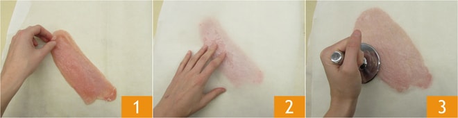 Pour préparer les roulades de côtelette, placez les tranches de viande entre deux feuilles de papier sulfurisé 1 2 et battez-les avec un attendrisseur 3.