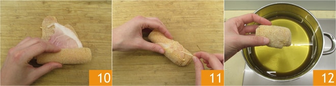 Une fois les roulades roulées 10, scellez-les avec un cure-dent 11. Pour la cuisson, vous pouvez les frire dans une abondante quantité d'huile de graines qui ne doit pas dépasser la température de 180° (vous pouvez la vérifier avec un thermomètre de cuisine). Faites dorer les roulades pendant quelques minutes 12, en les retournant pour une cuisson uniforme.