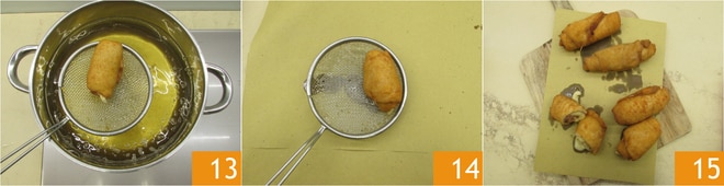 Égouttez-les avec une écumoire 13, en les déposant sur un plateau recouvert de papier absorbant 14. Servez les roulades de côtelette bien chaudes 15 !