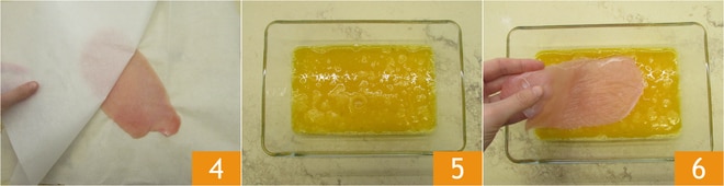 La viande sera plus fine et ainsi les fibres ne se briseront pas et elle restera tendre 4. Dans un petit bol, cassez les œufs et salez-les légèrement 5 et poivrez à votre goût, puis battez les œufs avec une fourchette 5. Immergez les tranches de dinde dans l'œuf une par une 6.