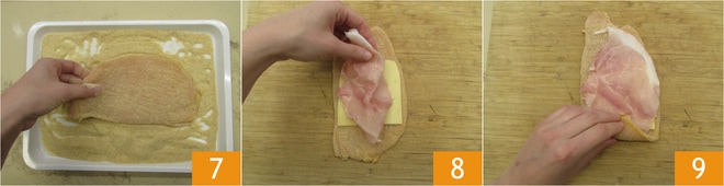 Passez-les ensuite dans la chapelure 7 des deux côtés. Si elles sont trop grandes, coupez-les en deux ou trois parties. Déposez sur chacune une tranche de fromage et une de jambon cuit 8. Roulez du côté court 9.