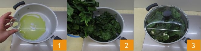 Pour préparer le roulé ricotta et épinards, commencez par cuire ces derniers. Rincez les épinards et séchez-les avec du papier absorbant. Versez ensuite l'huile dans une poêle, ajoutez l'ail 1, laissez-le dorer et ajoutez également les épinards 2. Couvrez le tout avec un couvercle 3