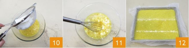 Tamisez la ricotta directement dans le mélange 10 et mélangez avec le reste en remuant avec un fouet 11. Versez ensuite le tout dans un plat 12, de dimensions 34x27 cm, tapissé de papier sulfurisé et légèrement huilé. Cuisez au four statique préchauffé à 180° pendant environ 25 minutes (si vous utilisez un four ventilé, cuisez à 160° pendant 15/20 minutes). L'omelette doit être moelleuse et compacte, pas brûlée en surface.