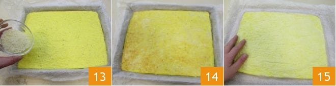 À la fin de ce temps, retirez l'omelette du four et saupoudrez toute la surface avec le Grana Padano DOP réservé précédemment 13. Remettez au four pendant 10 minutes supplémentaires pour faire fondre le fromage et créer une belle croûte dorée. Lorsque l'omelette est prête, retirez le plat du four 14, placez du film plastique sur une planche à découper; retournez le plat dessus et retirez délicatement le papier sulfurisé, puis laissez refroidir 15.