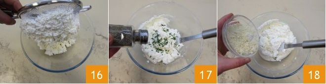 Entre-temps, occupez-vous de la ricotta. Tamisez-la directement dans un bol 16, ajoutez les feuilles de thym et rectifiez l'assaisonnement avec du sel et du poivre 17. Enfin, versez également le Grana Padano DOP 18 et mélangez le tout.