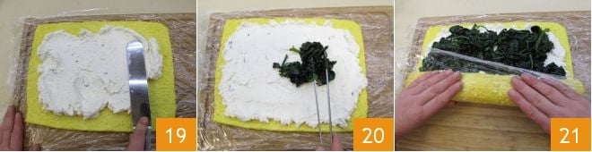 Lorsque l'omelette sera froide, garnissez-la en étalant la ricotta sur toute la surface 19 et en plaçant les épinards dessus 20 (qui auront désormais perdu l'excès de liquide). À ce moment-là, en vous aidant avec le film plastique, commencez à enrouler l'omelette 21.