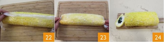 Veillez à l'enrouler bien serrée 22, en essayant de la resserrer juste assez pour la rendre compacte; fermez les extrémités à la manière d'un bonbon, en serrant bien le film 23 afin qu'elle conserve sa forme. Placez ensuite le roulé d'omelette à la ricotta et aux épinards au réfrigérateur pour qu'il se raffermisse et s'imprègne de saveur pendant au moins 1 heure. Une fois le temps écoulé, retirez délicatement le film plastique du roulé, découpez-le en tranches 24 et votre roulé d'omelette farcie sera prêt à être servi !