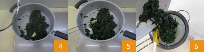 et cuisez pendant une dizaine de minutes jusqu'à ce que les épinards soient fanés 4. À ce stade, retirez l'ail 5 et transférez les épinards dans une passoire 6; de cette façon, ils se refroidiront et perdront l'excédent de liquide.