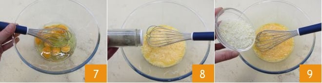 Occupez-vous de réaliser l'omelette : cassez les œufs dans un bol 7, battez-les légèrement avec un fouet et rectifiez l'assaisonnement avec du sel et du poivre 8. À ce moment-là, ajoutez 50 g de Grana Padano DOP râpé 9 et incorporez-le au mélange d'œufs, en réservant les 30 g restants.