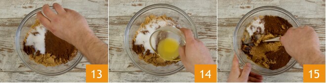 le sucre 13 et le beurre fondu désormais froid 14. Mélangez le tout 15,