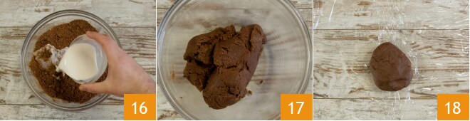 puis ajoutez une partie du lait 16 et continuez à mélanger. Versez le lait petit à petit pour mieux ajuster la consistance, il en faudra 90-100 g. Mélangez bien le mélange, jusqu'à ce qu'il soit compact et homogène 17. Transférez ensuite sur une feuille de film plastique 18.