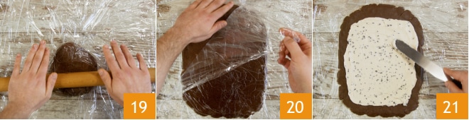 Couvrez avec un autre film plastique et étalez la pâte avec un rouleau à pâtisserie 19. Vous devez obtenir un rectangle d'environ 25x30 cm. Retirez le film plastique supérieur 20 et reprenez la crème du réfrigérateur. Étalez-la sur la base, en laissant les bords libres 21.