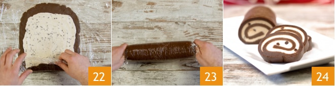 Aidez-vous du film plastique pour soulever le bord 22, roulez en serrant bien la pâte, mais délicatement. Vous obtiendrez votre roulé 23, conservez au congélateur pendant 2 heures avant de le couper. Une fois coupé en tranches, attendez quelques minutes avant de le servir 24.