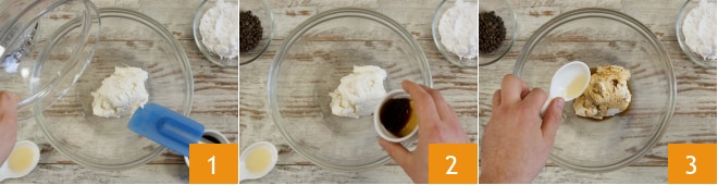 Pour préparer le roulé sucré sans cuisson, préparez le café dans la dose requise, avec la cafetière italienne. Laissez tiédir. Pendant ce temps, réalisez la crème en versant dans un bol la ricotta bien égouttée 1, puis ajoutez le café refroidi 2 et le rhum 3.