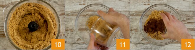 et mixez-les jusqu'à obtenir des miettes fines 10. Versez-les ensuite dans un bol 11, ajoutez le cacao en poudre non sucré 12,