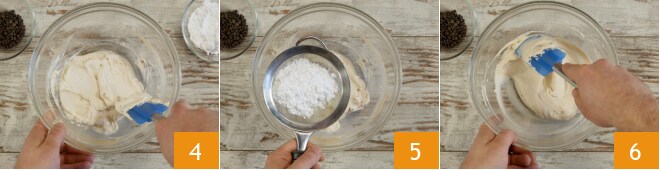 Mélangez avec une spatule 4, ajoutez le sucre glace en le tamisant 5 et mélangez de nouveau 6.