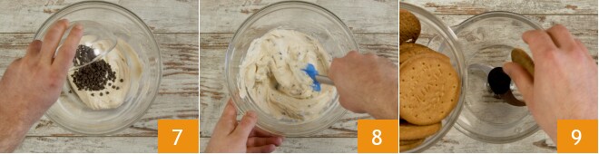 Ajoutez les pépites de chocolat 7, mélangez une dernière fois 8 et placez au réfrigérateur jusqu'à ce que la base soit prête. Ensuite, occupez-vous de la base. Faites fondre le beurre et laissez-le refroidir. Versez les biscuits secs dans un mixeur 9