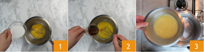 Pour préparer le rouleau bicolore au sabayon, commencez par ce dernier. Dans un cul-de-poule, versez les jaunes d'œufs et le sucre 1, mélangez-les avec un fouet avant d'incorporer également le marsala 2. Puis placez le récipient dans une casserole avec de l'eau et faites cuire au bain-marie à feu doux en remuant continuellement 3.
