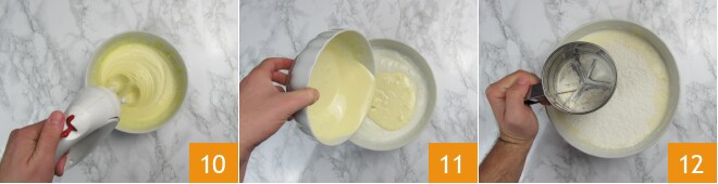 Une fois une crème assez dense obtenue 10, versez-la dans le récipient avec les blancs d'œufs 11, tamisez la farine 12