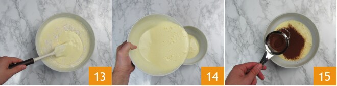 et incorporez le tout délicatement 13. Ensuite, divisez la pâte en versant un tiers du mélange dans un autre bol 14 et tamisez-y le cacao amer 15.