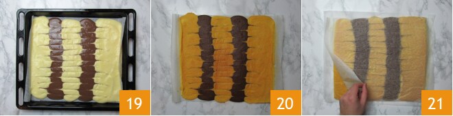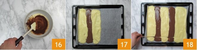 Et encore une fois, mélangez délicatement pour ne pas faire tomber le mélange 16. Maintenant que vous avez tout, vous devez verser le mélange sur une plaque tapissée de papier sulfurisé. En alternant, obtenez 3 bandes de pâte claire et 2 bandes de pâte foncée 17. Faites glisser une brochette en bois d'un côté à l'autre, de sorte que la pâte semble cousue une fois cuite 18