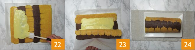 Récupérez le sabayon du réfrigérateur et étalez-le sur toute la surface de la pâte biscuit, en veillant à laisser libres quelques cm de chaque côté 22. Roulez délicatement en vous aidant avec la feuille de papier sulfurisé 23 et voilà votre rouleau bicolore au sabayon prêt 24.
