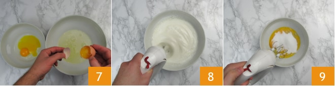 Entre-temps, passez à la pâte biscuit. Séparez les jaunes des blancs d'œufs 7 et montez ces derniers en neige ferme avec des fouets électriques ; une fois prêts, mettez-les au réfrigérateur 8. Passez aux jaunes, ajoutez le sucre et montez-les également 9.