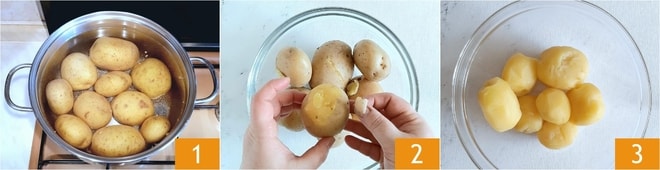 Pour réaliser le rouleau de pommes de terre, commencez par faire bouillir les pommes de terre 1 dans une casserole remplie d'eau froide : comptez environ 30 minutes à partir de l'ébullition (le temps peut varier en fonction de la taille des pommes de terre). Vérifiez la cuisson en les piquant avec une fourchette. Une fois cuites, égouttez-les et pelez-les encore chaudes 2 3.