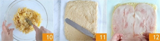 Mélangez soigneusement tous les ingrédients 10. Laissez reposer la pâte obtenue pendant 2 heures au réfrigérateur. Reprenez la pâte du réfrigérateur et étalez-la sur une feuille de papier sulfurisé, pour obtenir un rectangle d'une épaisseur d'un demi-cm, en nivelant avec une spatule 11. Garnissez la surface avec les tranches de jambon cuit 12.