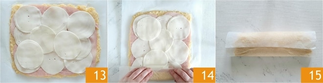 Déposez également les tranches de provolone 13. Roulez du côté le plus court en vous aidant du papier sulfurisé, avec des mouvements délicats mais fermes 14 15.