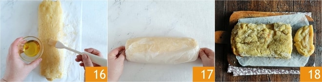 Ouvrez à nouveau le papier sulfurisé et badigeonnez la surface du rouleau avec de l'huile 16, puis refermez bien en scellant les extrémités comme un bonbon 17. Faites cuire à 180° dans un four statique déjà chaud, pendant environ 30 minutes. Sortez le rouleau du four et laissez-le refroidir sans le déballer. Une fois tiède, laissez-le refroidir complètement pendant 20 minutes au réfrigérateur. Déballez le rouleau délicatement et faites-le dorer au four en mode grill pendant environ 10 minutes. Sortez le rouleau du four et tranchez-le avec un couteau dentelé, seulement une fois tiède.