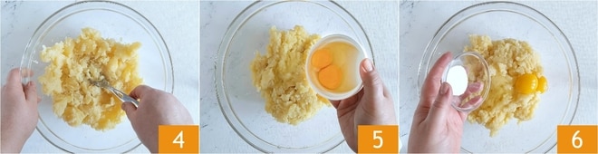 Écrasez-les avec une fourchette 4, puis ajoutez les œufs 5 et ajustez le sel à votre goût 6.