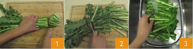 Pour réaliser les rouleaux avec Grana Padano et légumes, commencez d'abord par préparer la chicorée : éliminez la partie finale des tiges 1, coupez-la en 3 parties 2 et rincez-la sous l'eau courante 3.