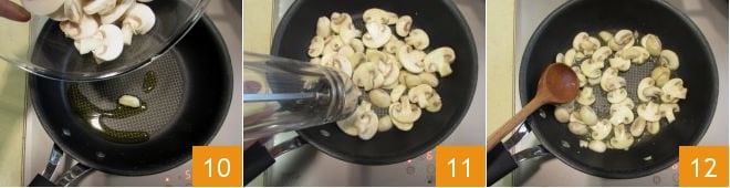 Dans une poêle, faites revenir une gousse d'ail avec un filet d'huile, puis ajoutez les champignons 10, salez, poivrez 11 et faites cuire à feu moyen pendant environ 5 minutes, puis laissez refroidir.