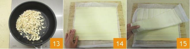 Enfin, faites griller les amandes dans une poêle bien chaude pendant environ 3 minutes, en faisant attention à ne pas les brûler 13. À ce stade, vous pouvez commencer à assembler les ingrédients : étalez le rouleau de pâte feuilletée sur le plan de travail 14, puis étalez par-dessus le rouleau de pâte à pizza, en les faisant coïncider 15.