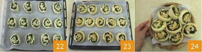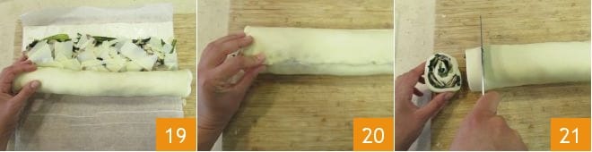 Enroulez la double pâte sur elle-même du côté le plus long 19 et pressez délicatement pour sceller la fermeture 20, puis éliminez les extrémités et coupez le rouleau en rondelles de 3 cm d'épaisseur 21.